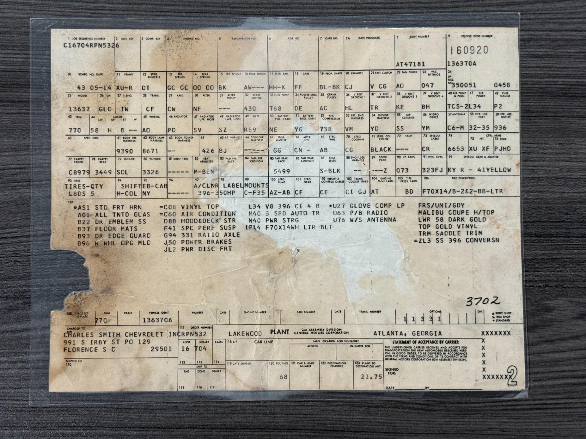 396 Big Block with Build Sheet
